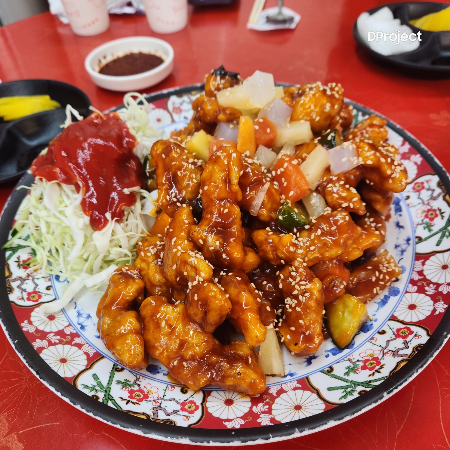 - 바삭한 튀김옷과 파인애플이 들어간 새콤달콤한 소스가 일품이에요!