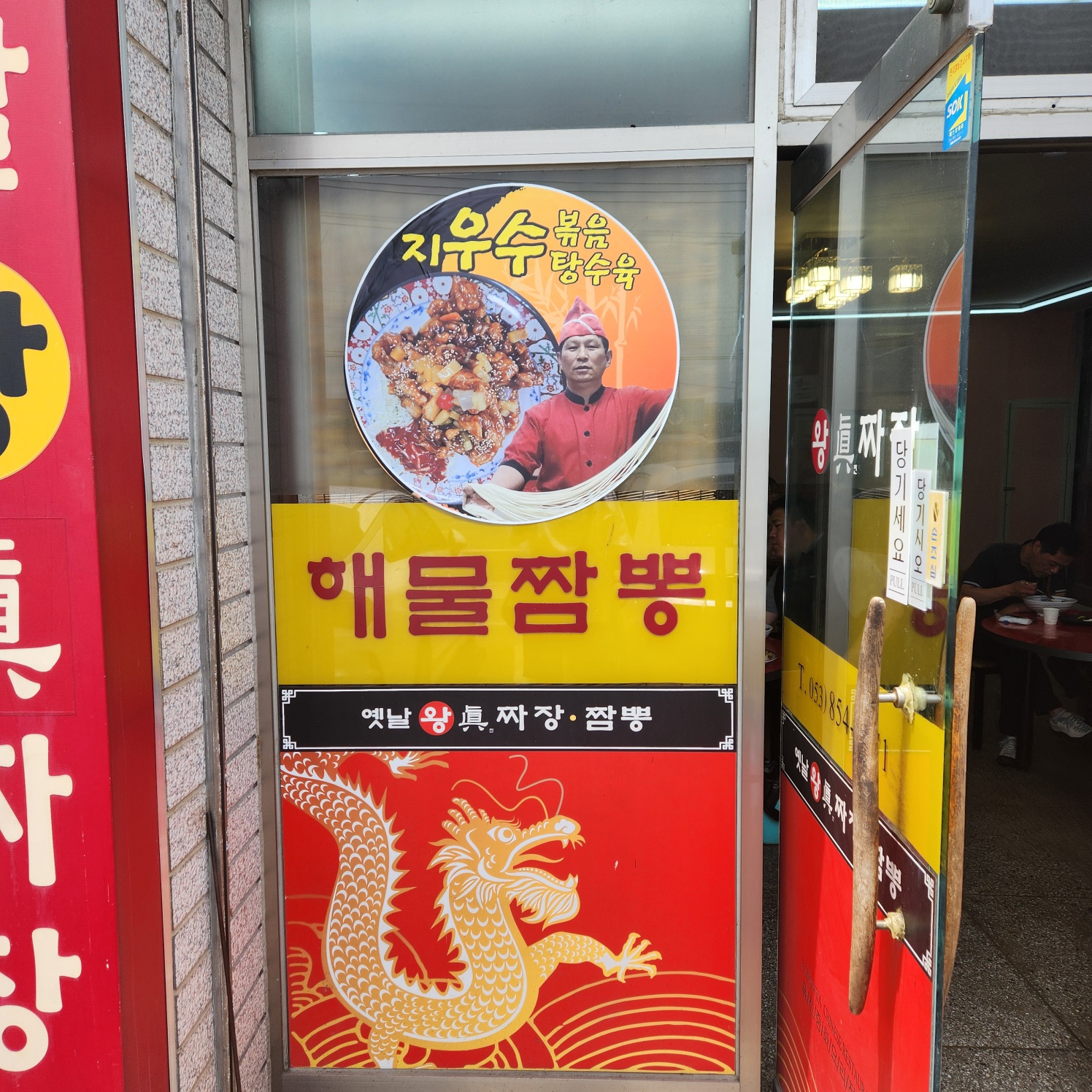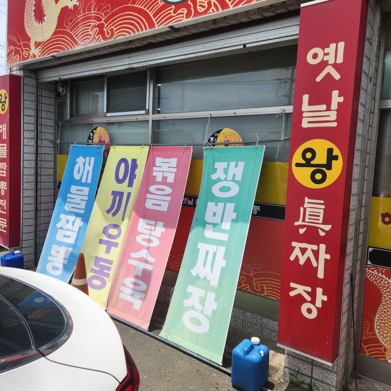 왕진짜장에 도착하자마자 눈에 띄는 건 바로 빨간색 간판과 컬러풀한 메뉴 현수막들이에요! 🎨 해물찜방, 아귀우동, 복음탕, 장반파절 등 다양한 메뉴들이 눈길을 확 끌어요.