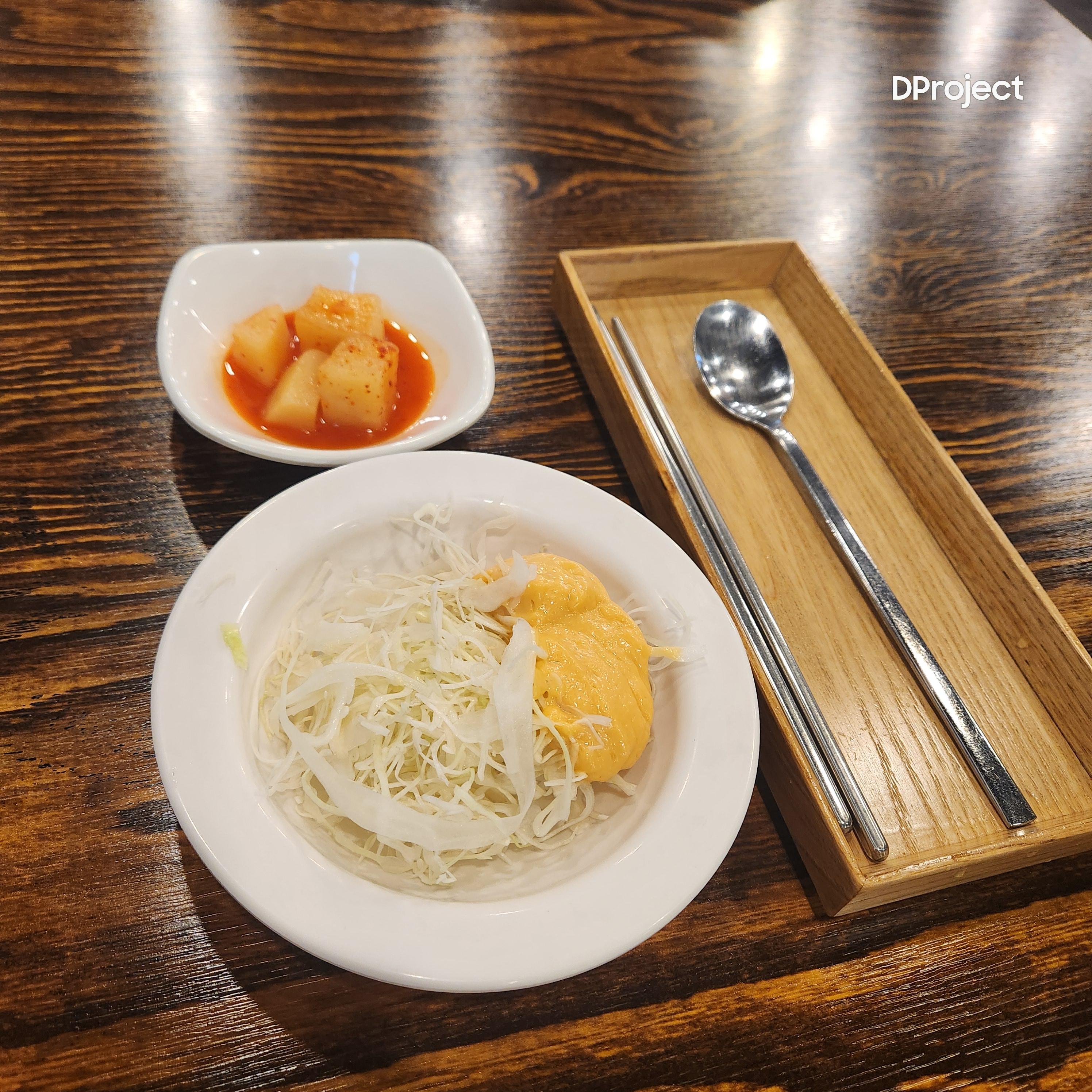기본 반찬으로 양배추샐러드와 깍두기가 나와요. 특히 양배추샐러드가 정말 아삭아삭하고 신선해서 맛있었어요! 🥗 입맛을 개운하게 해주는 역할을 톡톡히 해요!