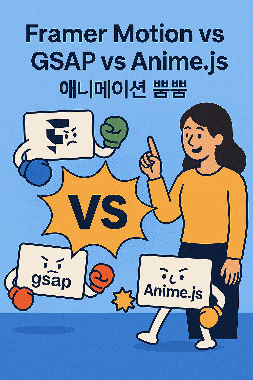 안녕하세요 🌟 오늘은 프론트엔드 필수 라이브러리 시리즈의 네 번째 이야기로, 웹사이트에 생명을 불어넣는 애니메이션 라이브러리들을 비교해볼게요! 정적인 페이지를 동적이고 생동감 넘치게 만들어주는 마법 같은 라이브러리들, Framer Motion, GSAP, Anime.js를 알아봅시다! 🎬